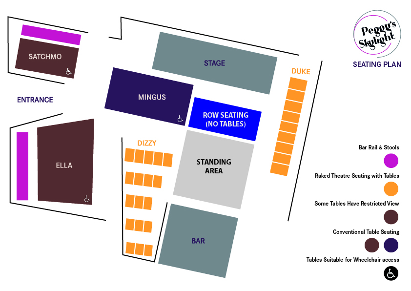 Our seating is organised into areas, some of which is fixed in place (such as Dizzy & Duke). Other areas are more flexible, to accommodate different group sizes, or even to be removed altogether for standing events.